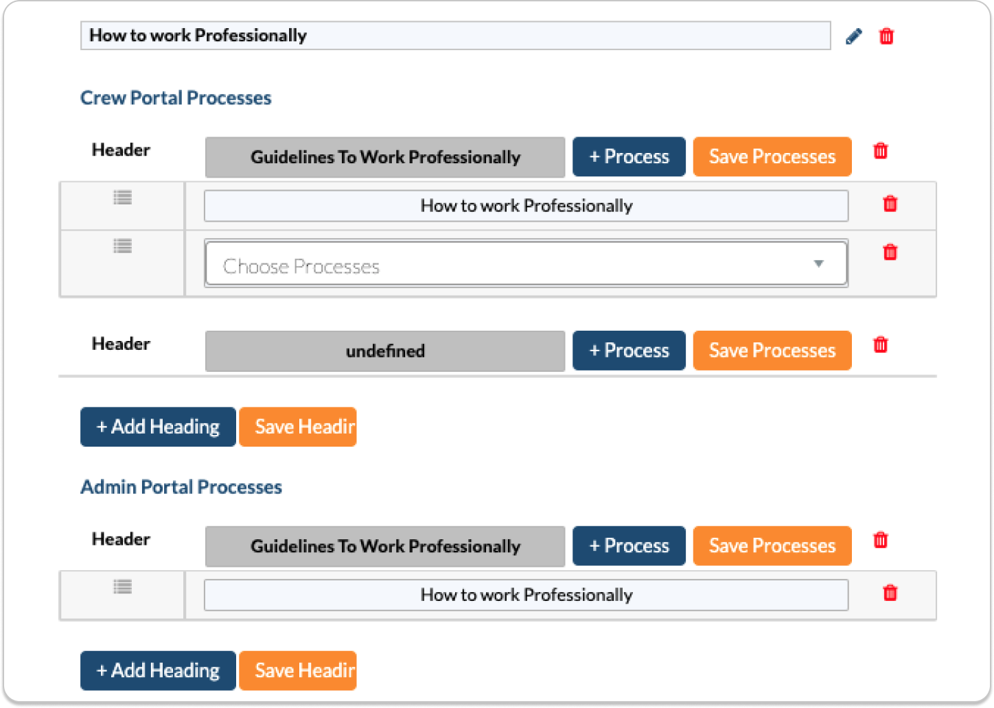 Processes can be saved and updated at any time. They can be saved just to the ‘Admin Portal Processes’ or it can be added to the ‘Crew Portal Processes’.
