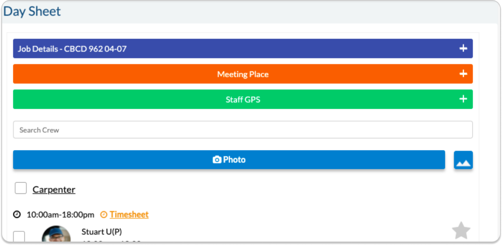 The Day Sheet allows you to enter times directly into the system and to report the performance of the crew (applicable for Team Leaders, Client and Duty Managers). This is how the Day Sheet will look like for Admin, Duty Managers, Team Leader and Supervisors. The Day Sheet for the crew will only have the Job Details and their crew time which they can update.