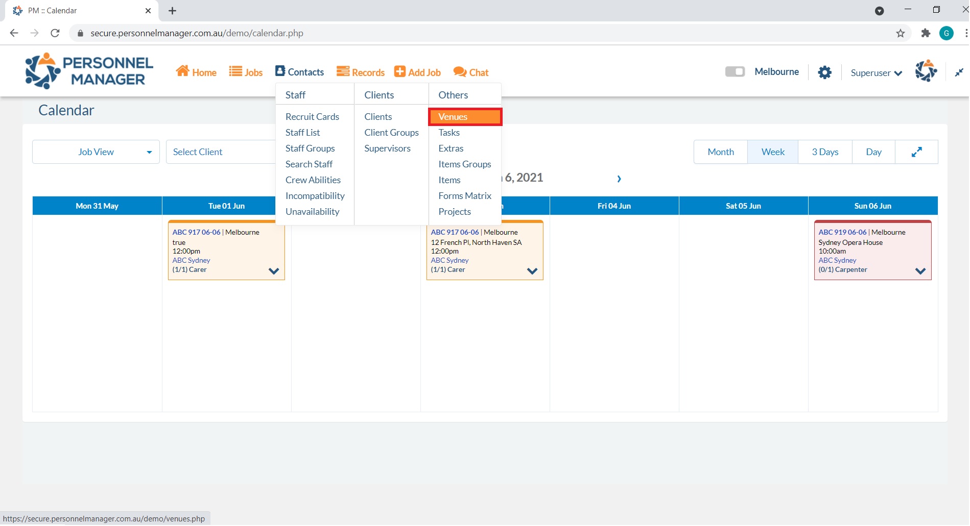 For example: ABC Hotel would be saved as a venue with address details like 123 Halifax St., Sydney CBD. And then the meeting places would be entered as “Meet at the front”, “Loading Dock”, “Call on Arrival”. There is no need to enter the street address in the meeting points as it’s will already be entered in the venue details.