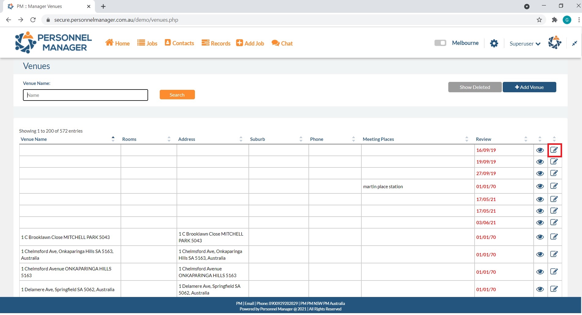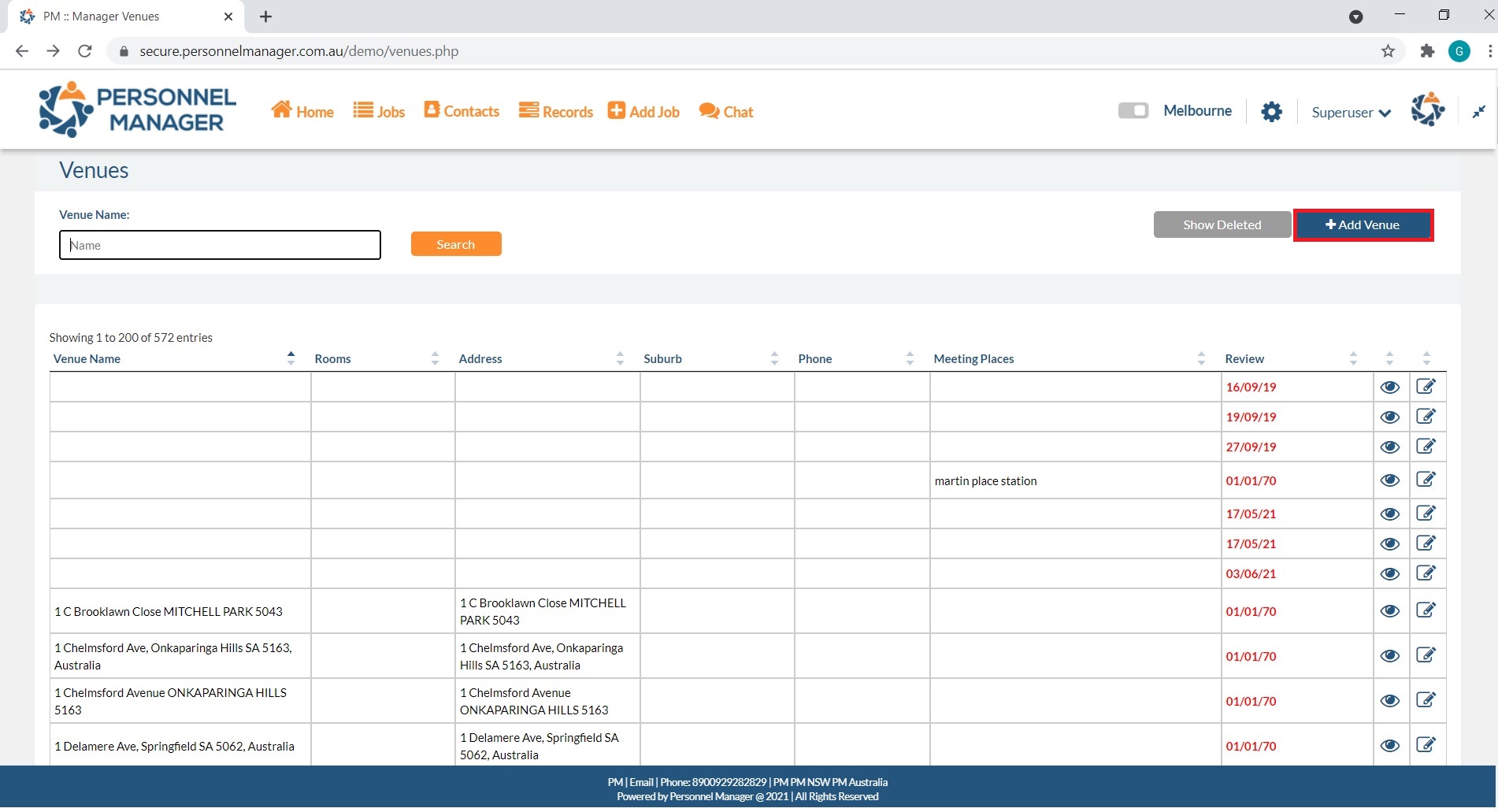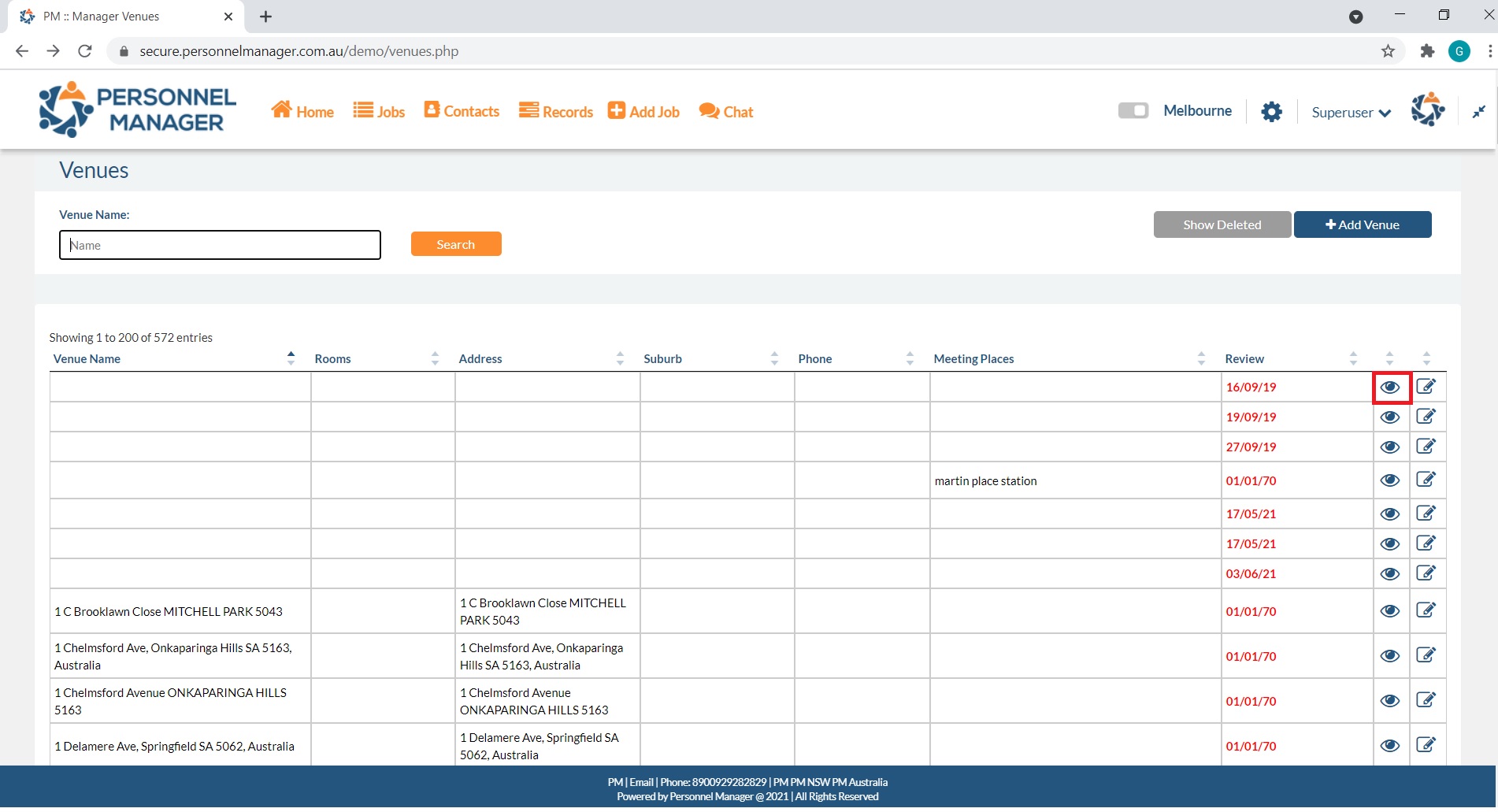 Venues can also be entered by typing a name in the “Venues” boxes in the “Shift Edit Page” or “Job Sheet Page” and pressing “Tab” on keyboard (or clicking anywhere). When a venue is entered for the first time, a new window pops open prompting you to ‘Create’ this new Venue. Once you click “Yes”, enter the details of the Venue including the address and postcode. To add a Meeting Place for this Venue, click the “Map” icon next to Meeting Place. Then click “Add New”. The Google Map will open and the pin which should be at the correct location according to the address. Enter the new Meeting Place Name, and click “Add” and close the map window. This information will go into the SMS message for staff. If the pin is in the wrong location, click on it and drag it to the correct location, then SAVE.