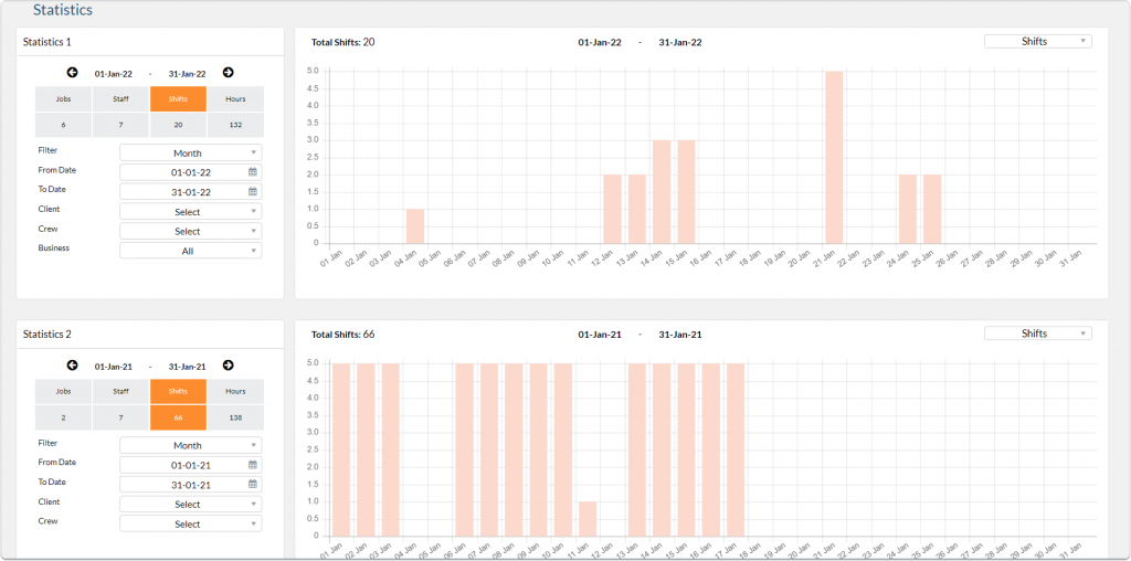 The statistics page allows you to view and compare two time periods at once. Enter and select the information you would like to compare for the two different graphs.