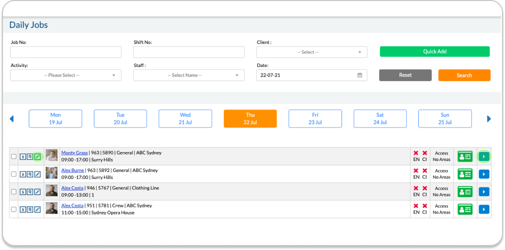 Search and filter job by entering one of the following fields at the top of the page Job NO, Shift No, Client, Activity, Staff or Date. To start a new search click reset.