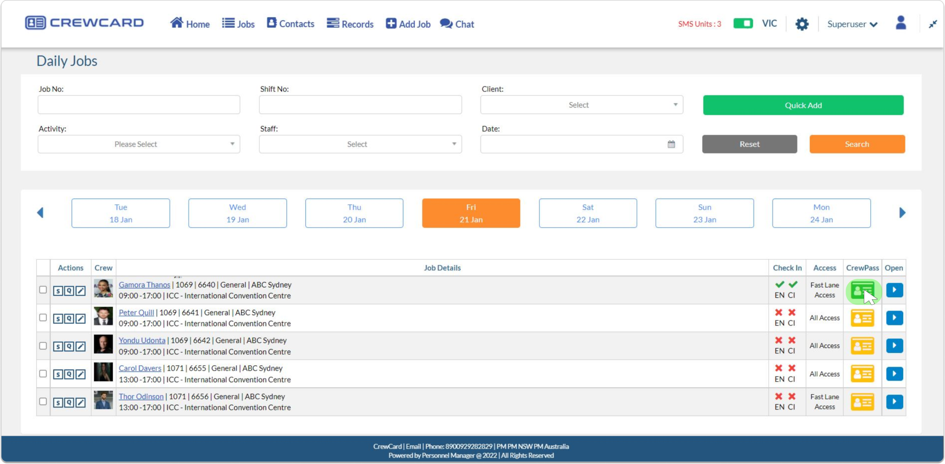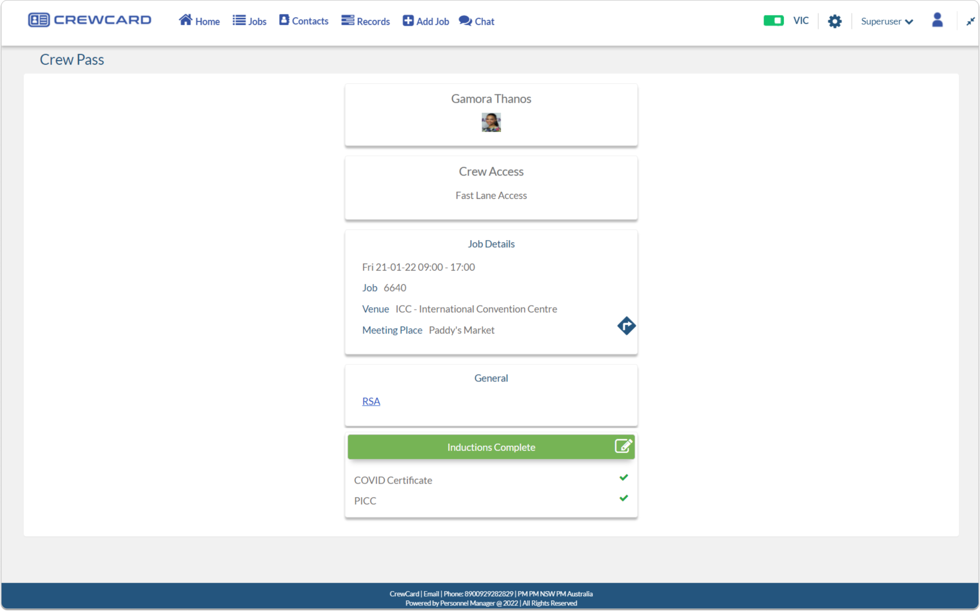 Once the card icon on the right of the screen has been clicked it will open the CrewPass and view the Access Level, Job details as well as any relevant qualifications or inductions that Crew Member will require for that Job. The CrewPass will automatically display all qualifications of the Crew Member that are associated with the Activity of that shift.