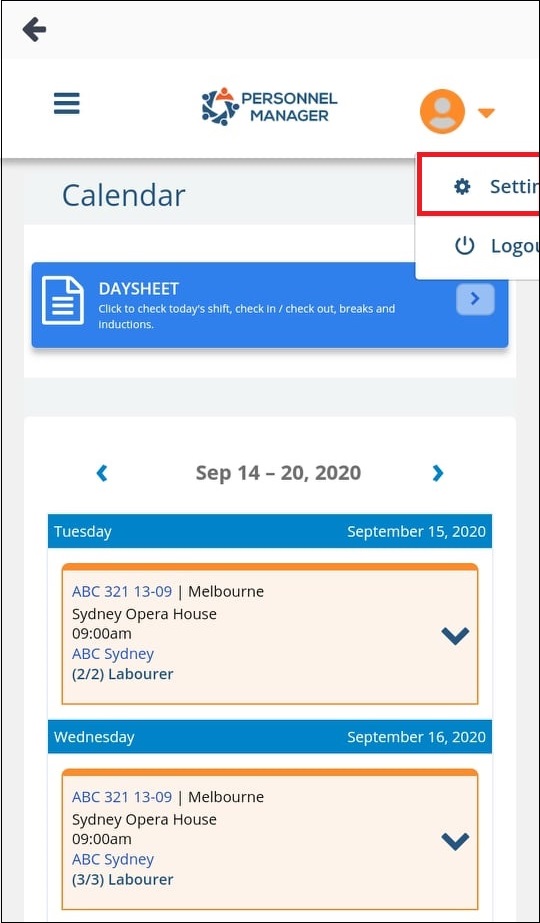 1. On the PM Client Web Platform tap the drop down arrow located at the upper-right corner of the page. A drop down menu will appear Tap Settings.